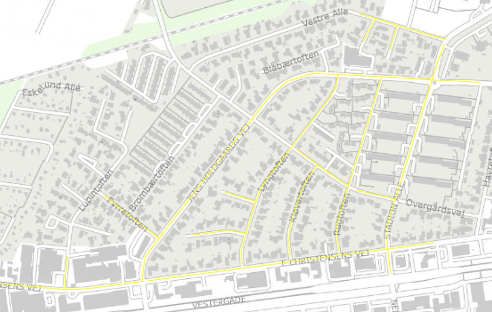 Figur 1: Område, hvor kloakken fornyes i etape 1, er markeret med gul.