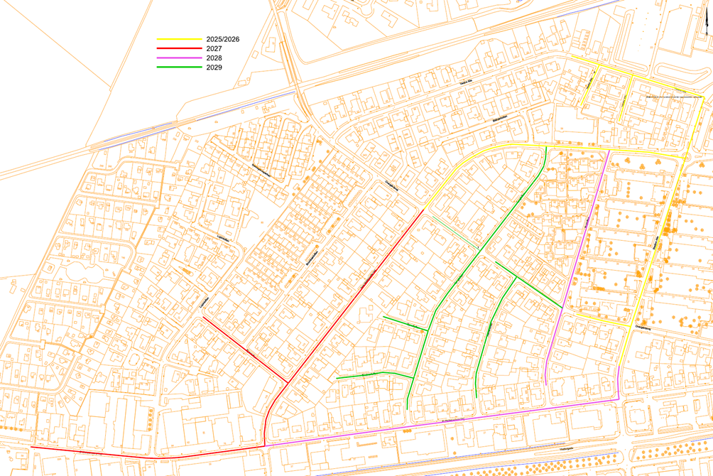 Figur 1: Område hvor kloakken fornyes i etape 1 er markeret med gul.